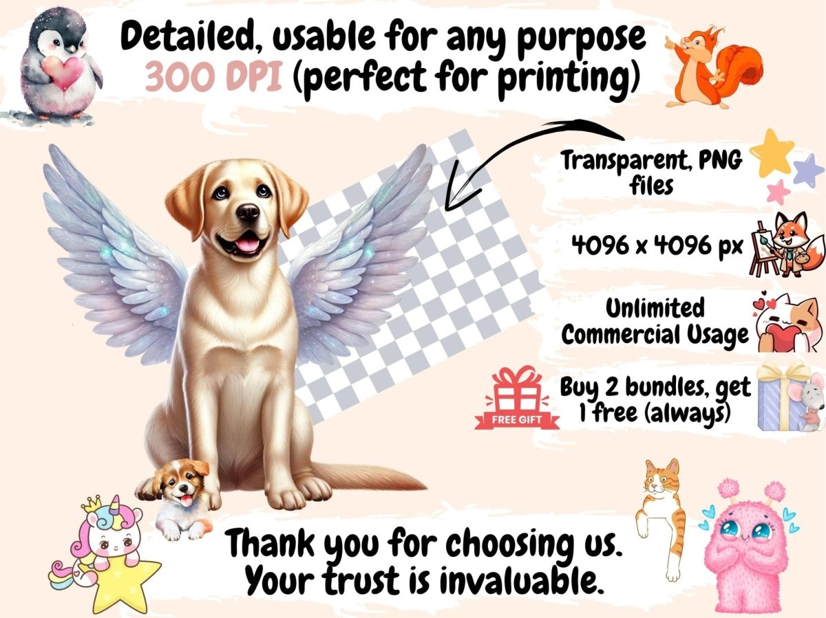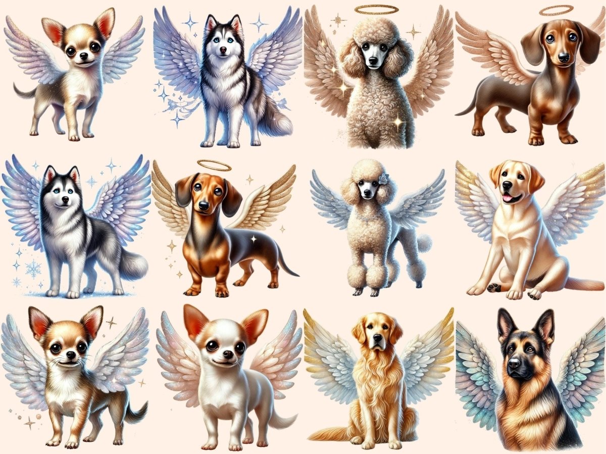 Angelic Dogs Clipart invites designers, crafters, and pet lovers to enhance their creative projects with heavenly flair. You get transparent PNGs, 300 dpi (4096×4096 px; 13.65×13.65 in / 34.67×34.67 cm), with clean cut edges, designed for effortless integration into both digital and print work... Show more...