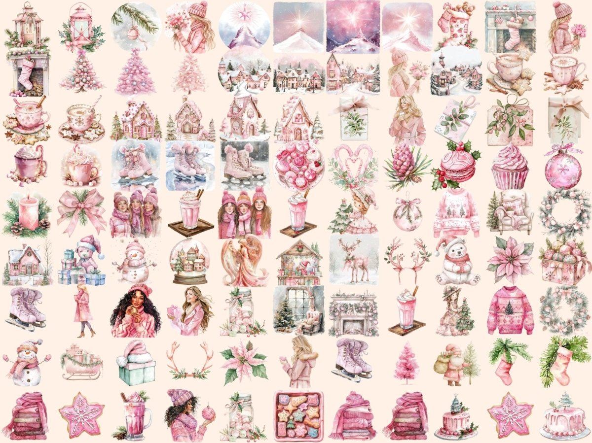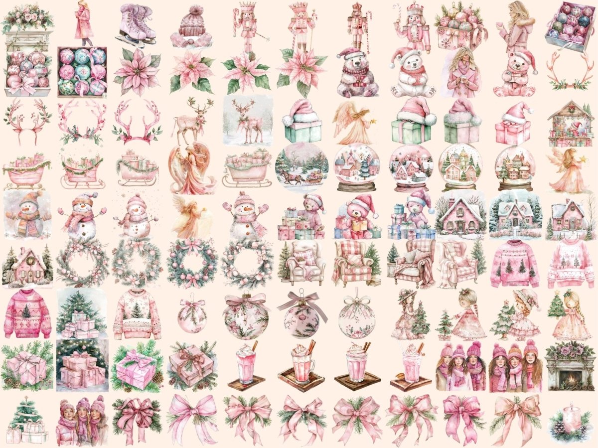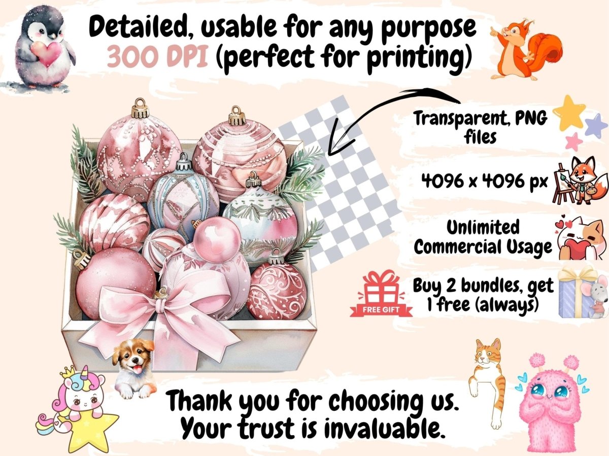 Pink & Mint Green Christmas Ornaments Watercolor Clipart