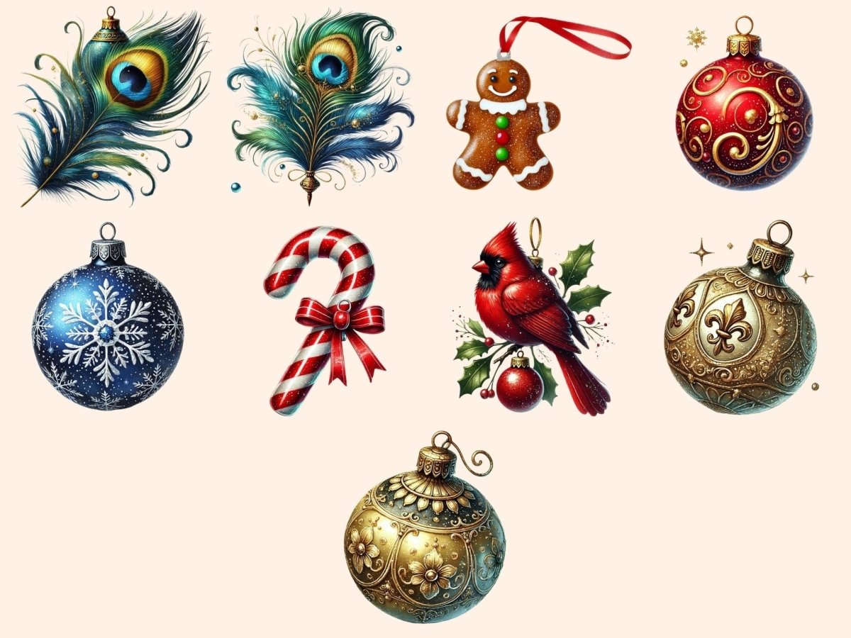 Red & Gold Christmas Ornaments Watercolor Clipart