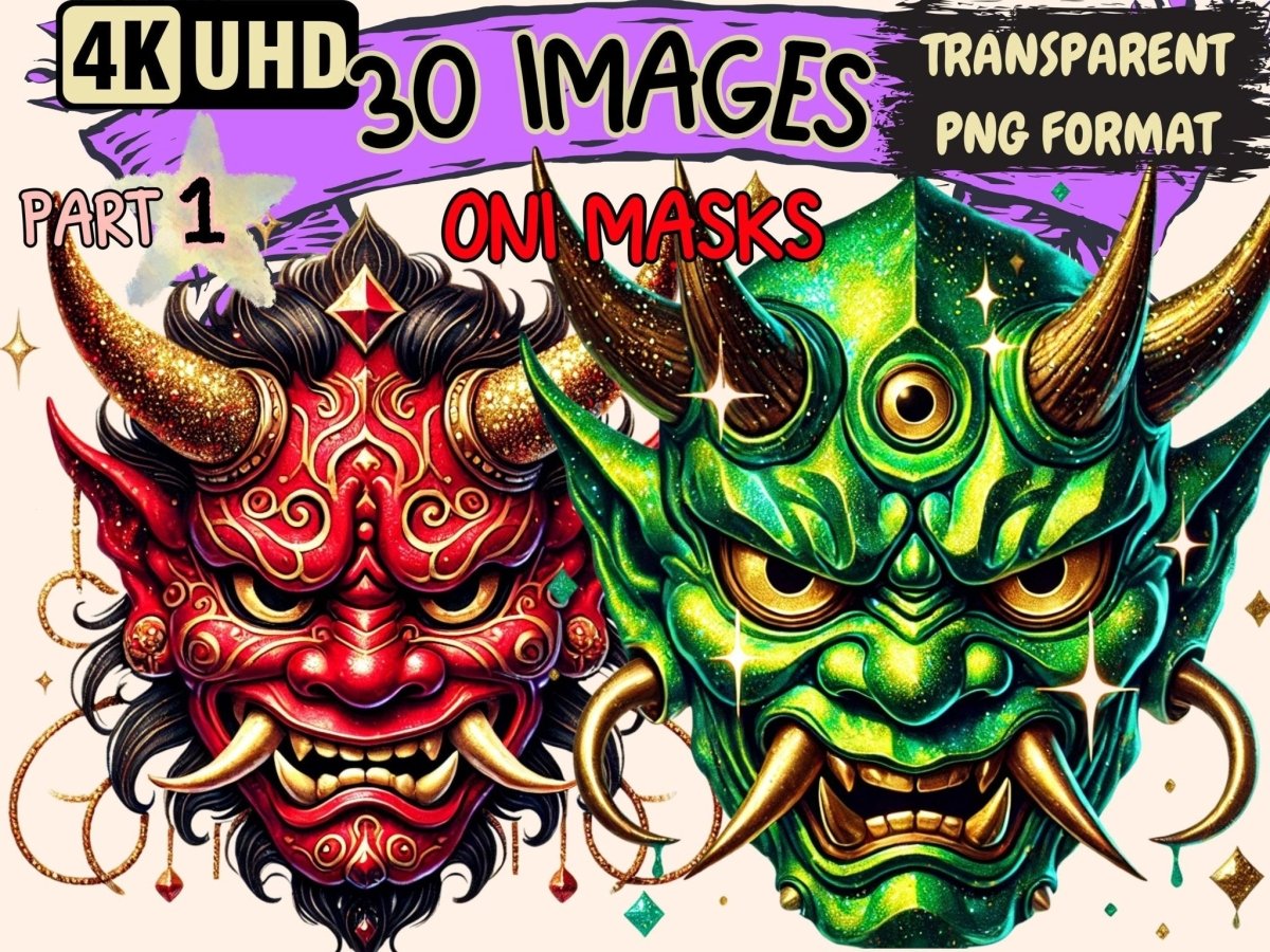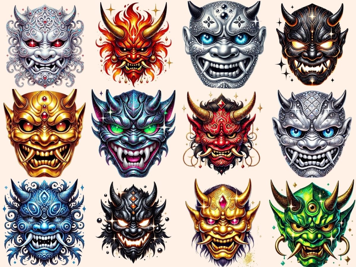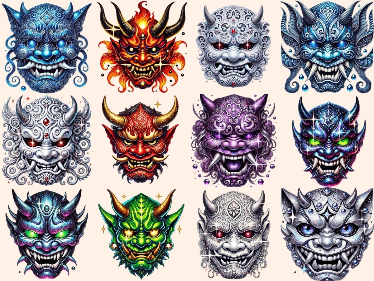 Oni Masks Clipart offers designers, artists, and cultural enthusiasts a versatile digital resource inspired by traditional Japanese folklore. You get transparent PNGs, 300 dpi (4096×4096 px; 13.65×13.65 in / 34.67×34.67 cm), with clean cut edges.