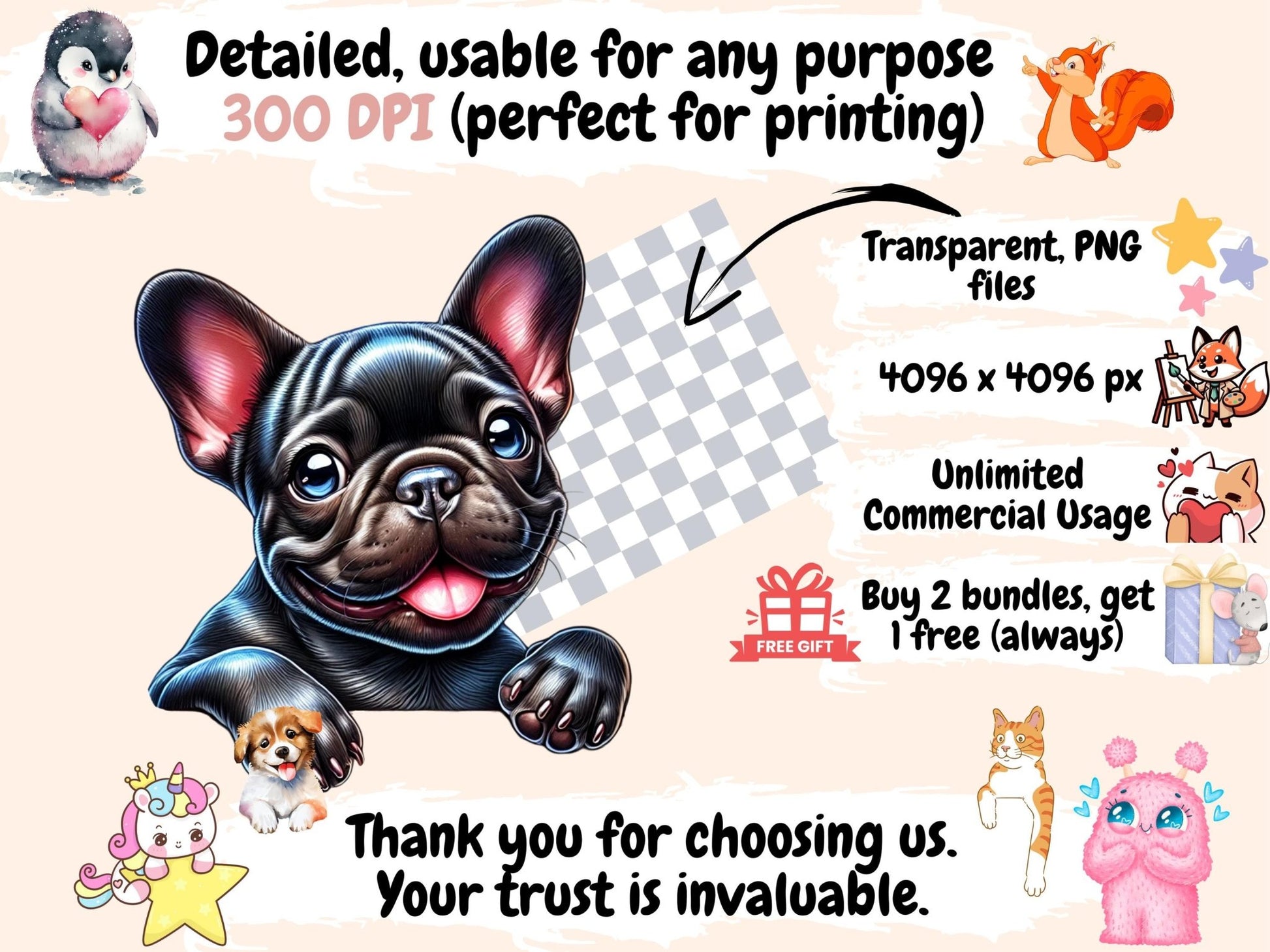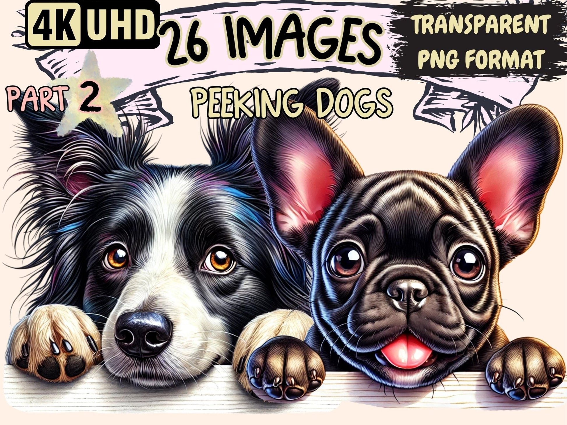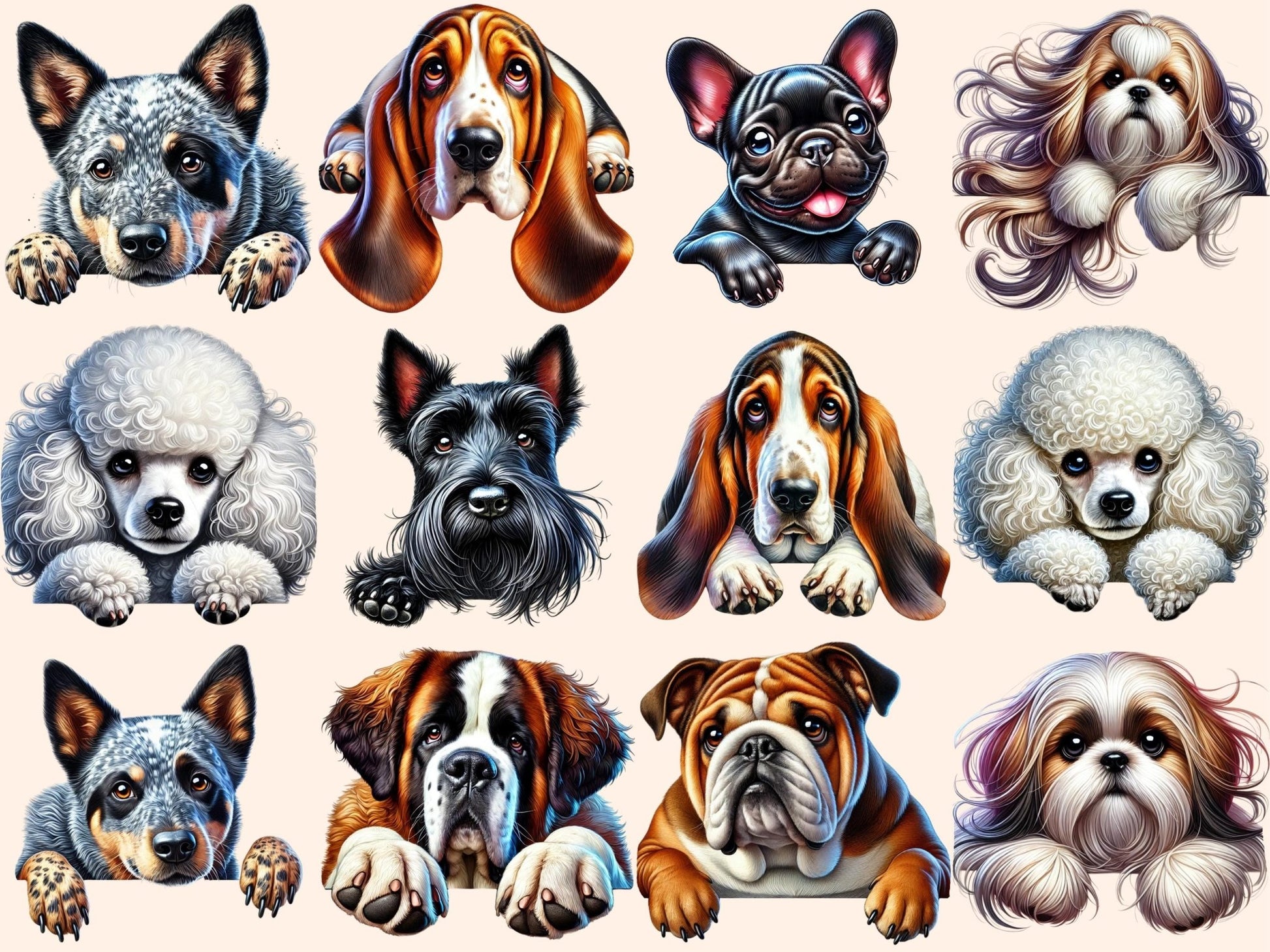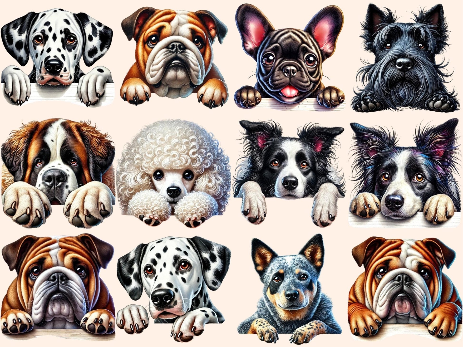 Peeking Dogs Clipart offers pet lovers, designers, and creative professionals a playful digital resource to enhance their projects with canine charm. You get transparent PNGs, 300 dpi (4096×4096 px; 13.65×13.65 in / 34.67×34.67 cm), with clean cut edges.