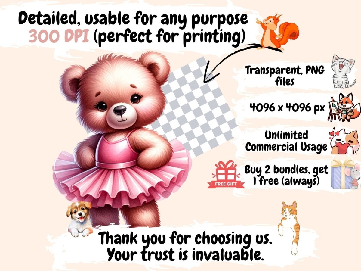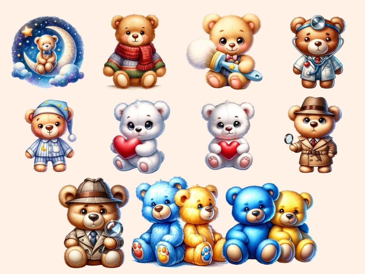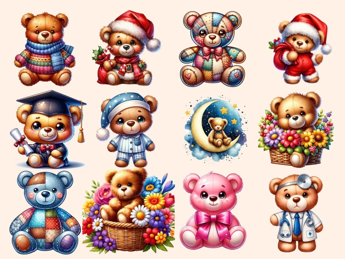 Teddy Bears Clipart is designed for designers, crafters, and toy enthusiasts seeking high-quality bear illustrations for their digital projects. You get transparent PNGs, 300 dpi (4096×4096 px; 13.65×13.65 in / 34.67×34.67 cm), with clean cut edges. Each artwork in this collection showcases th... Show more...