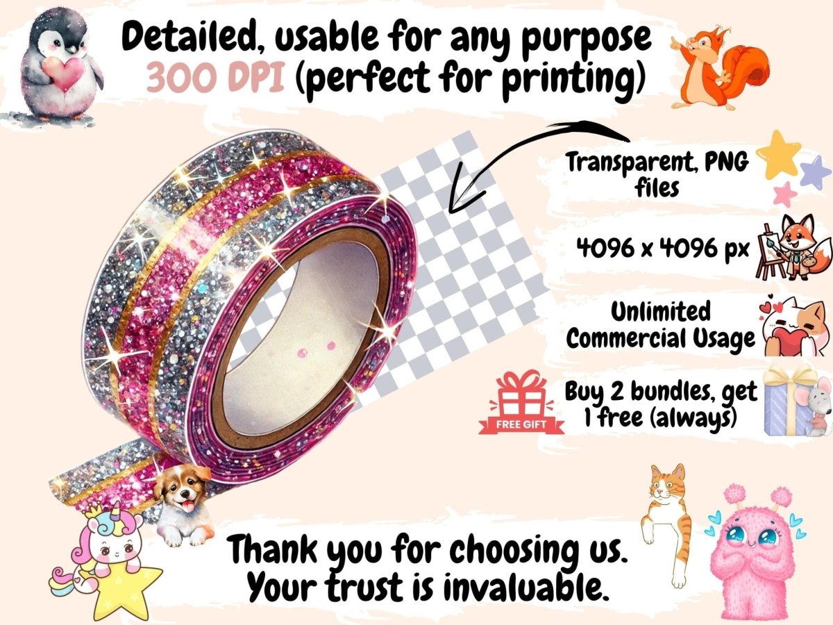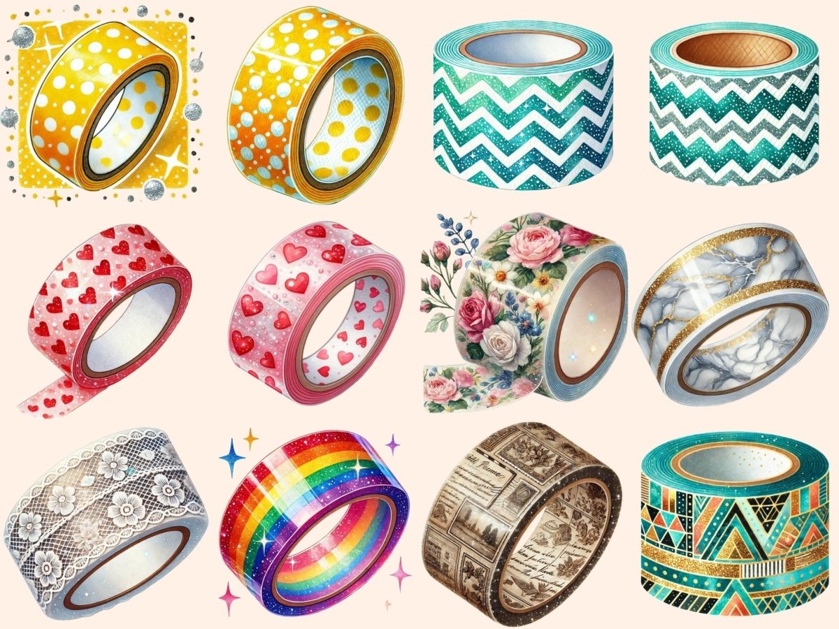 Washi Tapes Clipart is designed for digital artists, crafters, and creative professionals seeking high-quality, versatile clipart for personal or commercial use. You get transparent PNGs, 300 dpi (4096×4096 px; 13.65×13.65 in / 34.67×34.67 cm), with clean cut edges.